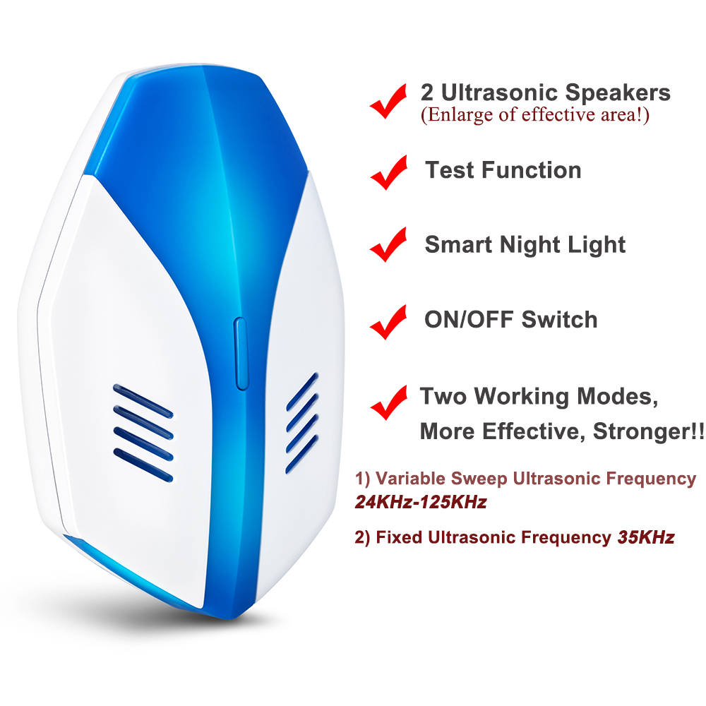 * UPGRADED ULTRASONIC TECHNOLOGY: This upgraded version has used smart chip to extend the range of ultrasonic frequency. Our 2019 upgraded ultrasonic pest control repeller applies stronger ultrasonic wave to disturb nervous system of the pests. Fleas, mice, bugs, rodents, roaches, insects, mosquitoes, ants, spiders, rats, bed bugs, fruit flies will be forced out of your home.